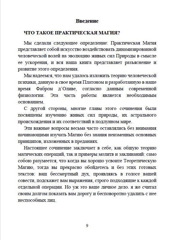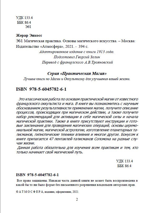 "Это классическая работа по основам практической магии от известного французского оккультиста и мага. В книге вы познакомитесь с научным обоснованием результативности применения магии, получите описание процессов, происходящих при магическом действии, а также получите набор рекомендаций для активации в себе магической силы и начала магической практики. Также в книге присутствуют инструкции и готовые заклинания для проведения магических операций, основы церемониальной магии, магической астрологии, изготовление планетарных талисманов, гипнотические техники влияния и многое другое. Бонусом к книге прилагается 47 пентаклей-талисманов Соломона на разные случаи жизни. Данная работа обязательна для изучения всем практикам и тем, кто только начинает свой магический путь."