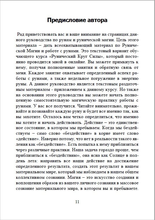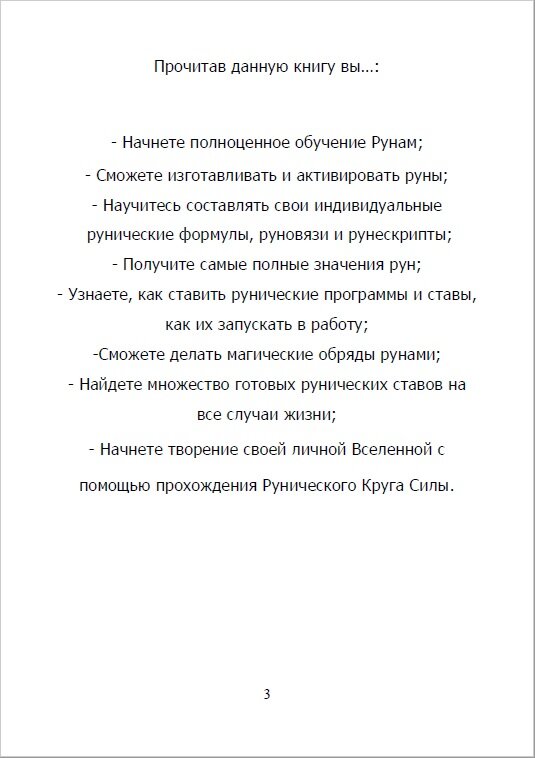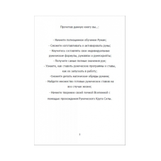 "Это полноценное обучающее руководство по рунам на основе полугодового  курса "Рунический Круг Силы", который проводит автор в онлайне. Вы  пройдете и проживете все руны на личном опыте, сможете изготавливать и  активировать руны, научитесь составлять свои индивидуальные рунические  формулы, руновязи и рунескрипты, получите самые полные значения рун,  узнаете, как ставить рунические программы и ставы, как их запускать в  работу, сможете делать магические обряды рунами, найдете множество  готовых рунических ставов на все случаи жизни, начнете творение своей  личной Вселенной с помощью прохождения Рунического Круга Силы."