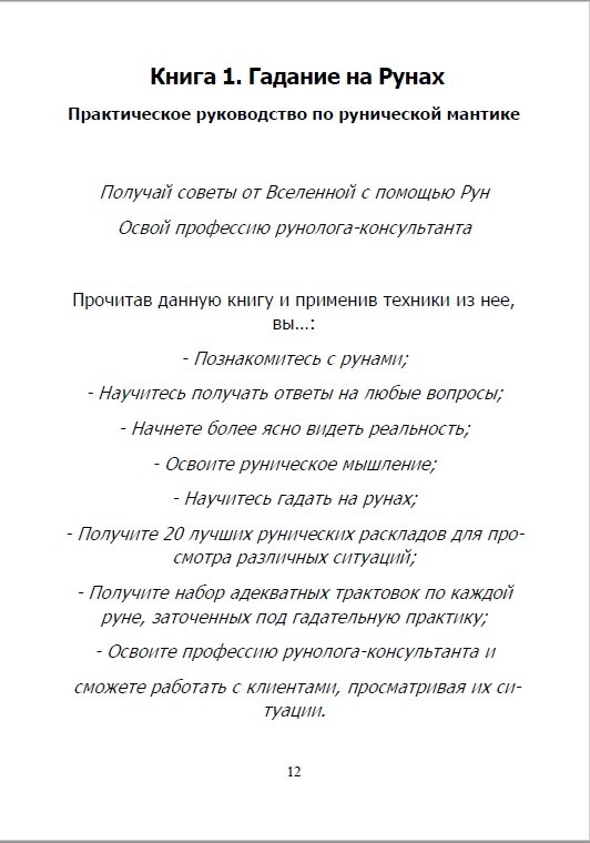 "Цель книги - научить вас практически работать с рунами. В этом руководстве вы получите техническое описание работы при гадании (мантике) и магии. Здесь соединены две книги руководства - "Гадание на рунах" и "Практическая руническая магия". В первой дается руководство по гаданию на рунах (мантика), лучшие расклады для просмотра ваших ситуаций, разобраны готовые примеры из практики и описан метод работы с клиентами. Во второй части даются основы рунической магии, чтобы вы сразу могли приступить к работе с рунами, ставить рунические ставы, делать обряды, активировать и запускать руны. Юрий Исламов - практикующий маг и рунолог, тренер рунического искусства. Автор книг "Рунический Гримуар", "Турборуны", "Рунические Формулы", "Рунический Круг Силы" и обучающих курсов по Рунам и Магии."